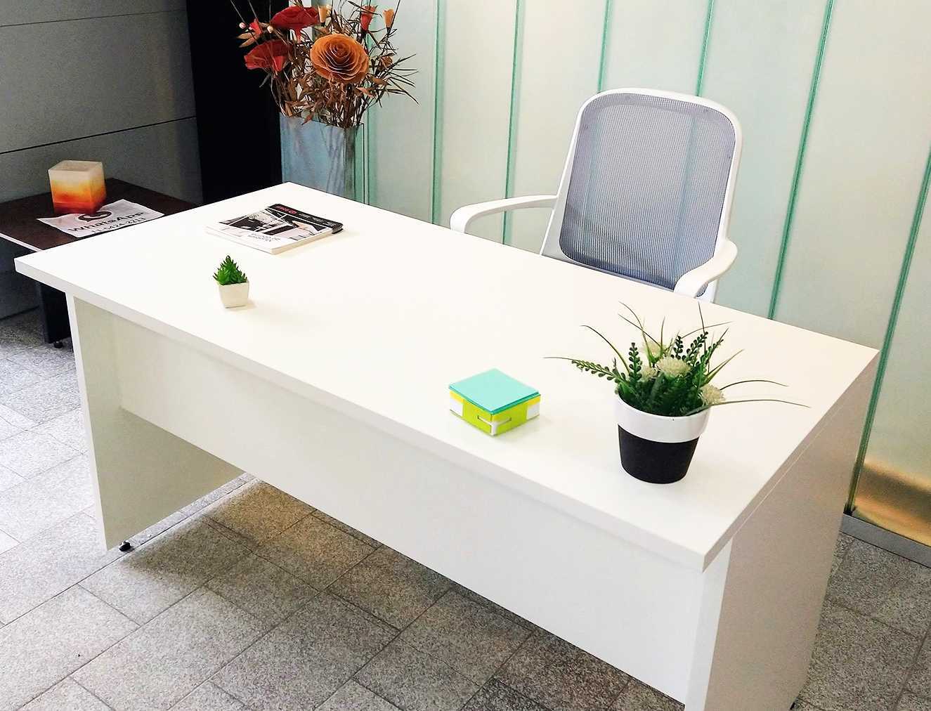 Mesa fabricada en melamina de 25 mm, con medidas 1370 x 700 x 730 mm. Cuenta con tapacantos de ABS, cubre piernas, y sistema de ensamblado Mini Flix, fácil y duradero. Incluye regatones plásticos con regulación de altura. Color blanco, ideal para oficinas y espacios de trabajo.