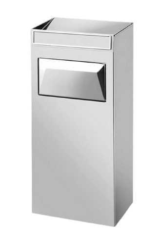 Depósito extraíble para cenicero y residuos con tapa vaivén para residuos generales. Sus medidas son 75 cm de altura, 21 cm de profundidad y 31 cm de ancho. El exterior está fabricado en acero inoxidable, mientras que la bandeja y el cesto extraíble están pintados con acabado epoxi.