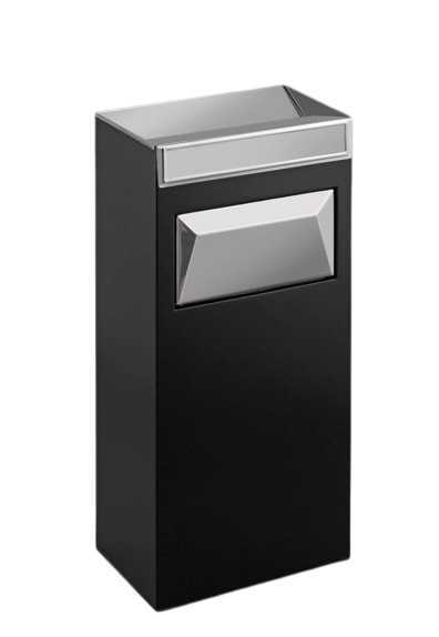 Cenicero y tapa de cesto fabricados en acero inoxidable. Depósitos extraíbles para cenicero y papelero. Tapa de residuo con sistema vaivén. Medidas: 30 cm de ancho x 21 cm de profundidad x 75 cm de altura. Pintado en epoxi negro brillante.